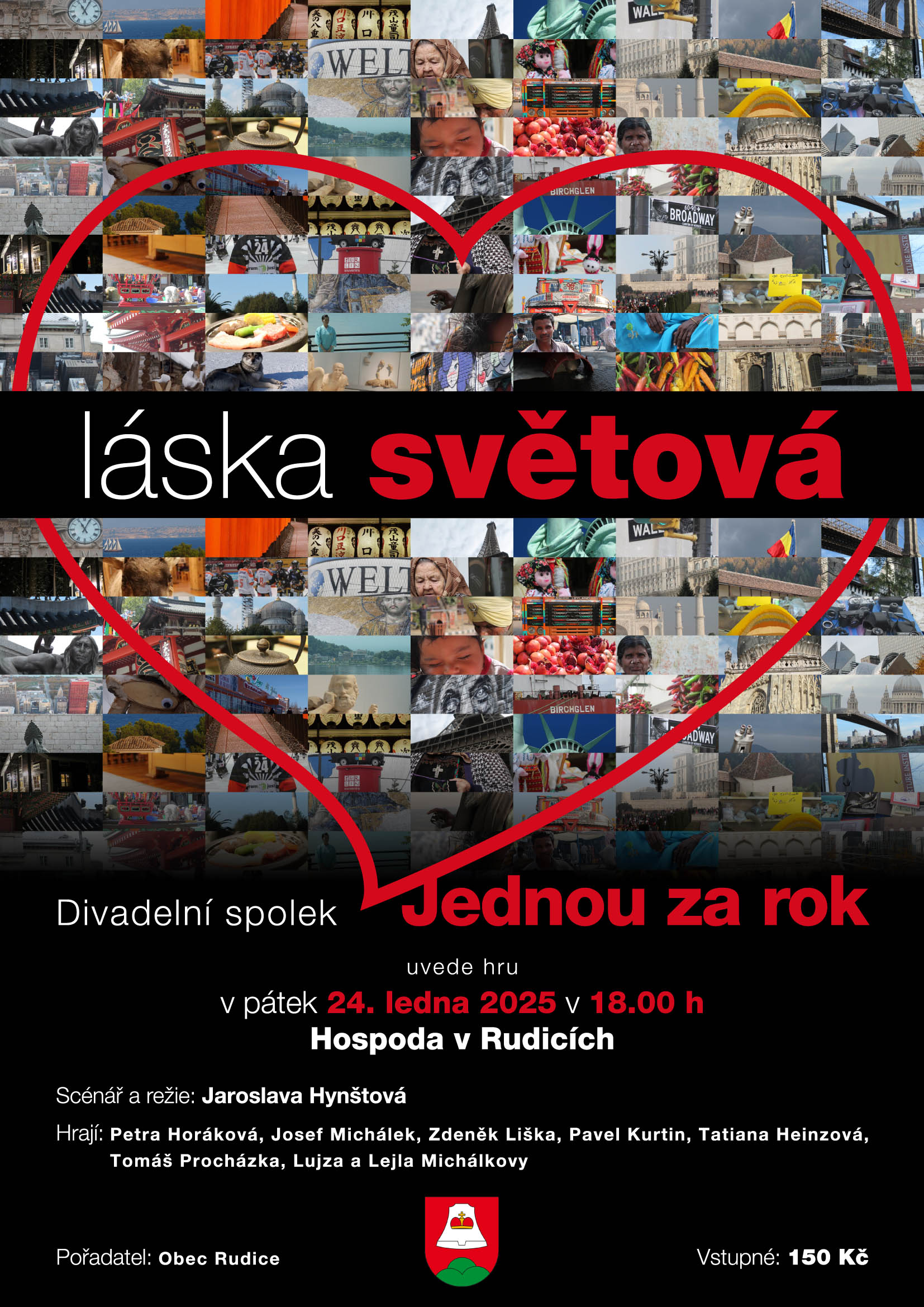 Obec Rudice Vás zve na divadelní představení „Láska světová“, které odehraje ochotnický spolek z Luhačovic v pátek 24. ledna 2025 v 18.00 v Hospodě v Rudicích. Vstupné 150,- Kč, děti a mládež do 18 let 100,- Kč.