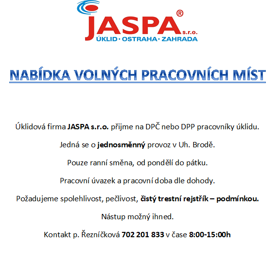 Firma Jaspa s.r.o. v Uherském Brodě přijme pracovníky úklidu na HPP na jednosměnný provoz. Dále přijme na DPP nebo DPČ pracovníky úklidu na zástupy a mytí oken. Více informací podá p. Řezníčková na telefonním čísle 702 201 833.